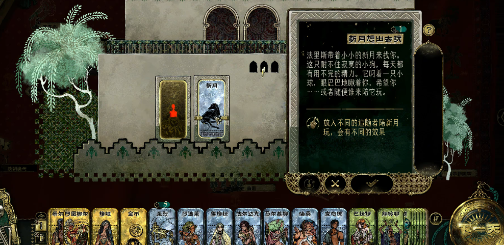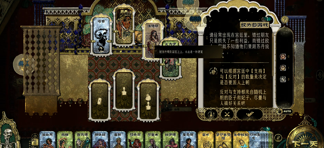 这时自己有好几个选择:最简单的是花20个金币,要是当前手上有其他女性角色,那么放入娜依拉可能会触发额外剧情并获得金币。接着放入玛尔西的话能加金币,而放入拜玲耶则能得到一个不结的思绪思潮,注意这些选择最终都会导向法德耶来访事件。法德耶来访事件限时三天,这里的选择就重要了,自己可以选择单纯享受欢愉但这样的话没啥后续。更常见的做法是派自身或梅姬去接待她,这样能增加1点善名并触发下一步的苏丹的特使事件,如果想走暴力路线也可以选择杀死她,但这需要消耗一张石杀戮卡并增加1点恶名,后面还会随机招来一个苏丹的惩罚事件。