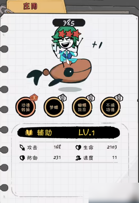 接下来介绍的角色是庄周,这位角色是一位中路角色,他的定位是属于辅助。但是这位本身的自我回复能力很强。每一回合都可以回复自身80%攻击力的生命值,并且他自身还可以还有着75%的概率清除自身或者我方队友的控制状态。庄周最强的地方在于他的另一个被动蝴蝶效应,这个技能可以提高庄周30%的生命值和20%免伤,在开场的时候会给我方攻击最高的单位提供80%的免控和5%的速度,持续两个回合。