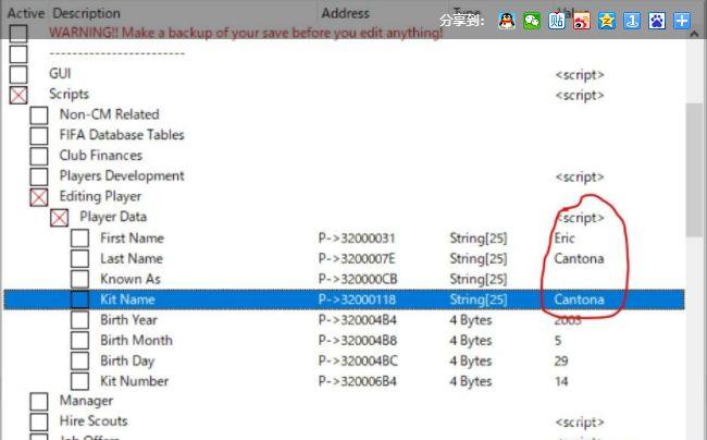 2、我们再回到修改器,这次打开GUI的PlayersEditor,由于高亮停在了“坎通纳”上,Players Editor会很贴心的替我们自动找到他。