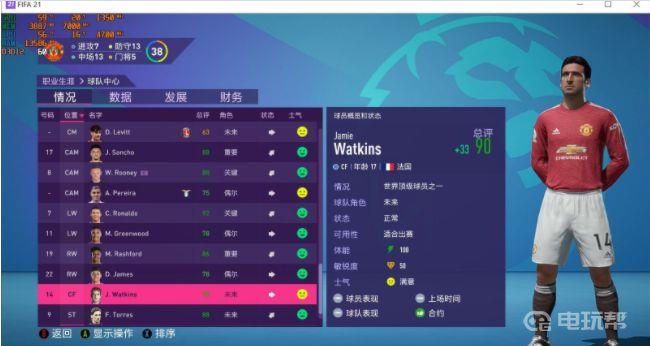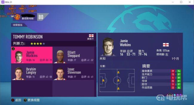 4、回到游戏里发现收到了新的球探报告,查看后可以看到第一个球员的头像变成了坎通纳。虽然属性和名字还都没变,不过没关系,我们先把他签下来并且提升到成年队。