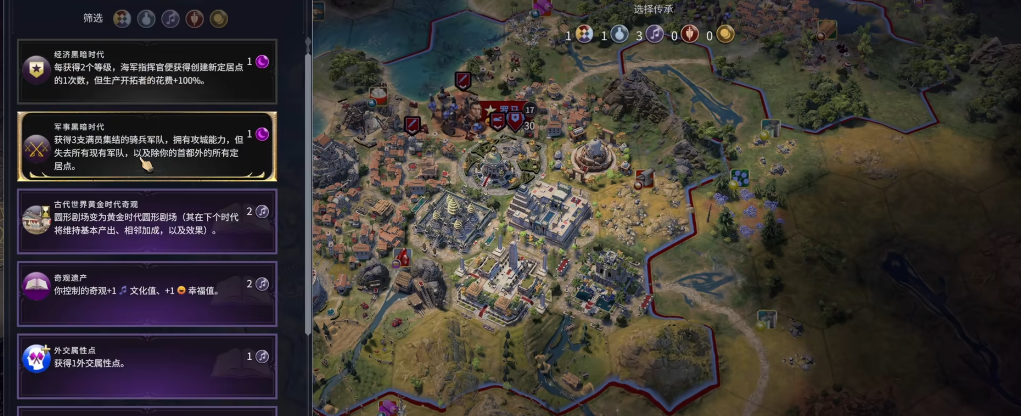 后续在每个时代都得选一条路来走,这条路线上设好了几个明确的里程碑任务,比如说文化路径的任务可能就是让自己建造好几个世界奇观。只要每完成一个里程碑就能立刻拿到一些奖励,比如更多的时代点数或者其他好处,更重要的是这里能赚到传承点数。这些点数可是宝贝,它们能大大加快自己在游戏最后阶段达成胜利条件的速度,要是在前两个时代古典和中世纪里,把某条路径上的三个里程碑全都完成了,那么在进入下一个时代时就能获得一个特别强大的黄金时代传承。