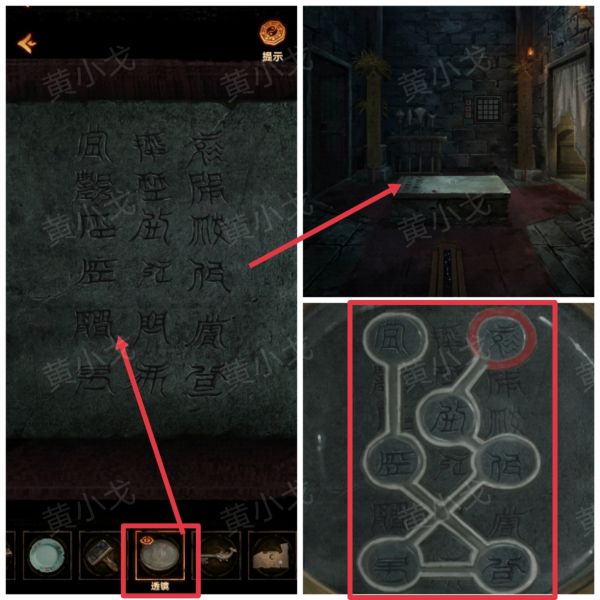 14、点击左侧棺材上的机关,根据[主殿]石床上的线索,按顺序按下字按钮,打开棺材