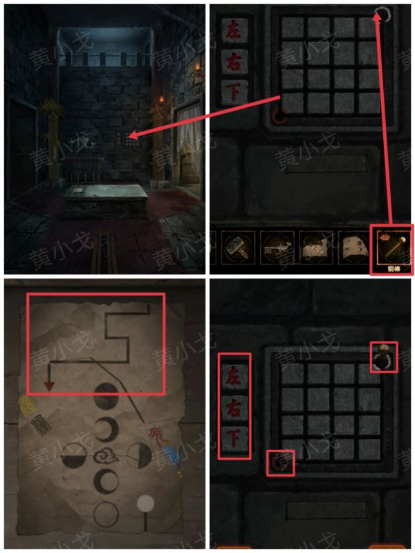 23、点击墙上的机关,装上;根据拼好的下卷纸张上的路线,按顺序按下按钮
