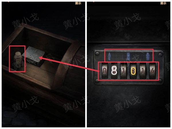28、点击棺材里的盒子上的密码锁,根据上面的图案提示,结合各场景中对应物品的数量,输入密码:08 10 14