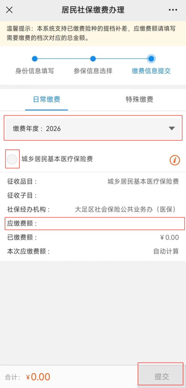 第五步:缴费信息提交。(选择2026年,根据自己需求选择缴费档次)
