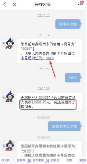 页面弹出可办理销卡的信用卡尾号,输入提示的信用卡尾号。