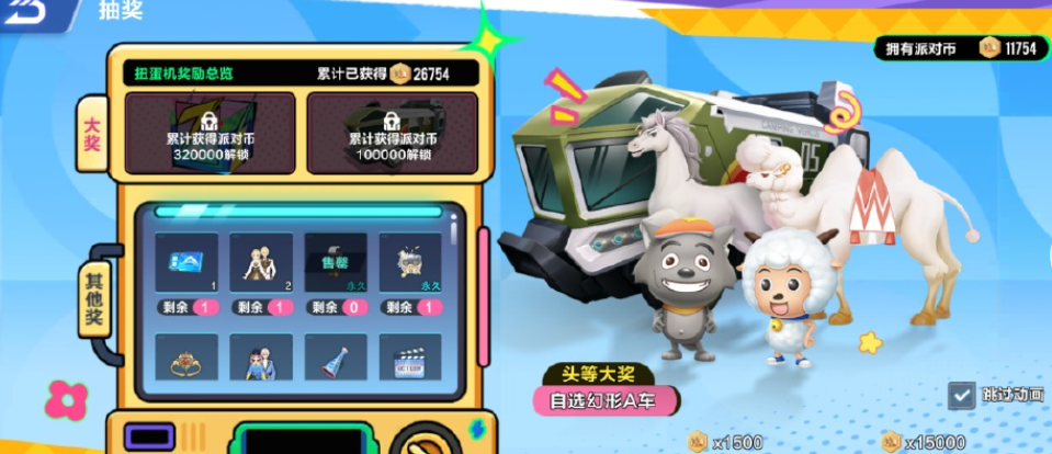 到了最后一轮前的关键节点,卡牌的使用更是决定胜负的关键。领先的话一定要把收益翻倍卡留到这里用。最后一轮的派对币结算权重更高,翻倍后能直接锁定第一。攒够派对币后,可去模式外围扭蛋机抽奖。有自选幻形A车、永久套装,全机甲和全机甲皮肤随机体验。还有联动专属奖励,如蜡笔小新主题套装、幻形车,这些奖励都值得花时间兑换。