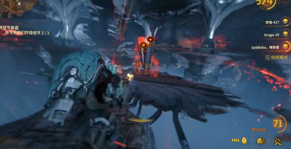 任务进行到这里会有一个视角切换,你会短暂地操控战神卡尔。这部分流程就是按部就班跟着任务提示走,先去目标点拿武器,然后回头去寻找并解救卡尔的兄弟。解救过程要注意,互动后左边会出现进度条,当进度条走到一半时,可能会提示信号变弱,这时候你需要回到地面上发光的圈子里,信号才能恢复稳定,然后才能继续解救。这个任务整体上算是剧情引导和轻度解谜结合,难度更多体现在对机制的熟悉上,而非纯粹的战斗强度。完成破障者任务后,游戏里与执行官相关的一系列功能,比如每周的执行官猎杀任务,才算是对你正式开放了。