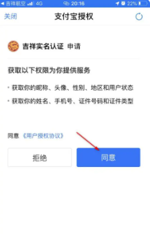 完成授权:在弹出的授权界面点击,授权吉祥航空获取支付宝实名信息。
