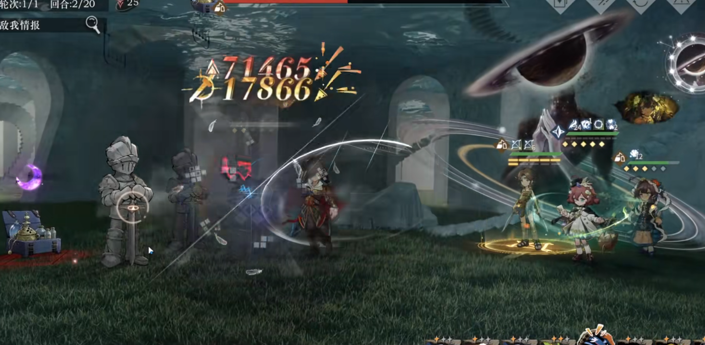 这个淑女状态除了普攻可以进入以外,还有两种方式。第一种就是快速支援,我们让它快速支援入场,就会进入这个淑女状态,点普攻键也会打淑女普攻,整体的攻击范围会长一点。或者也可以通过闪避反击,打完闪避反击之后,也会直接进入这个状态。左上角有五个圆心、两个圆圈,这五个圆心不会变成圆圈,但是会溢出来两个。所以看到圆心和圆圈同时亮起的时候,在攻击打完之后,会进入一个漂浮状态,比如说我们淑女普攻打完,就会打着伞飘在空中,是一个漂浮状态。