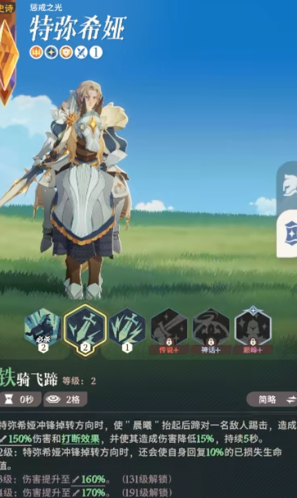 英雄专精在战斗中攻击力会得到提升,当咱们第一次释放骑士之心之后,攻击力还会额外提升。势不可当是在释放骑士之心两次之后,我们就会进入势不可挡的状态。当我们在这个状态下,会一直处于霸体的状态,冲锋的伤害也会变为真实伤害,并且每秒还能回复一部分最大生命值。这个技能让我们在后期战斗的时候,有更强的生存能力和输出能力。觉醒之力是使用骑士之心冲刺到的敌人,会永久降低护甲,而且能够多次使用。弥希娅在队伍中主要是充当坦克和输出的角色,所以在阵容方面需要配上治疗和控制能力的英雄。