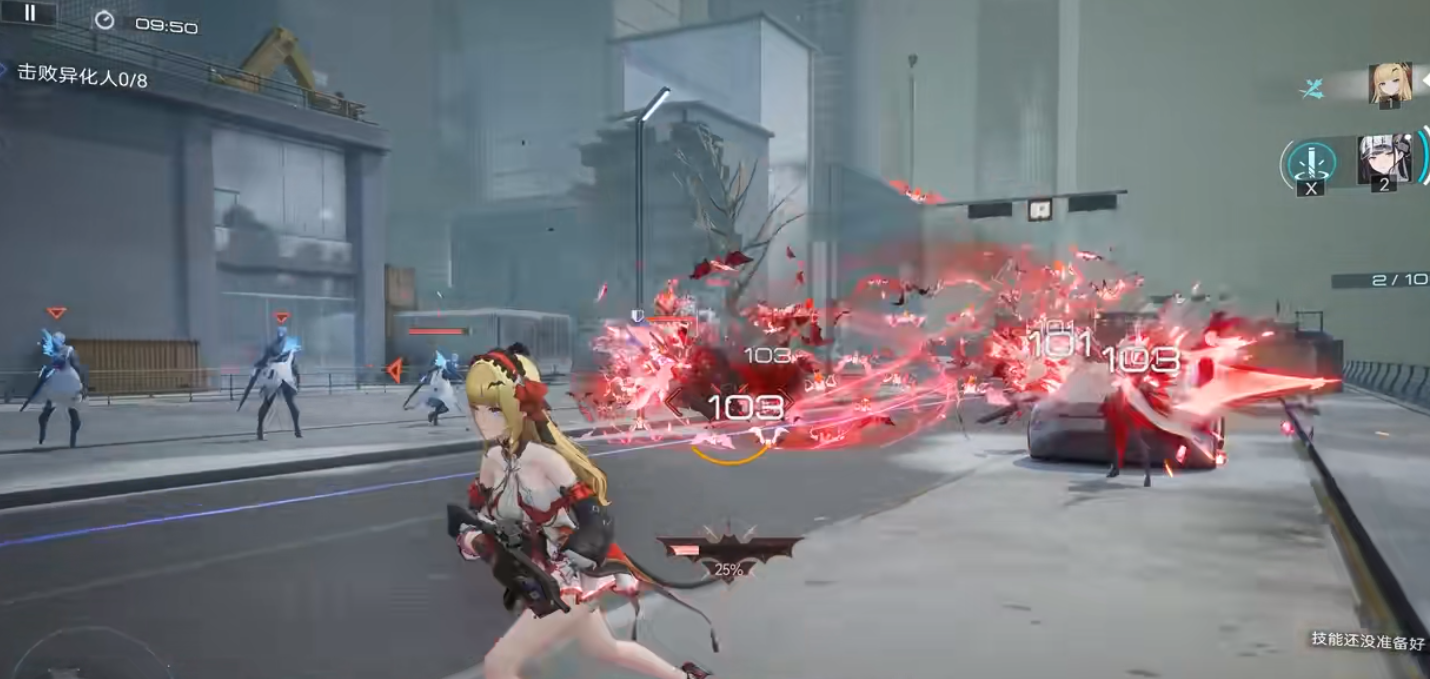当我们在空中的时候,最好就提前预防闪避,从而防止落地的时候直接被打。如果闪避成功的话,就直接接上闪避反击,没闪到的情况下,直接打冲刺攻击,开始循环下一轮的普攻。这样就构成了相对安全的连招,但是第三段的普攻时间还是很久。这个时候咱们就能使用强化普攻来抵消,在我们使用技能之后,都会获得一个强化普攻的充能。使用连携技、强化特殊技或者支援突击之后,带有充能的角色,前面两段的普攻不会改变,但是第三段的攻击方式会加强。