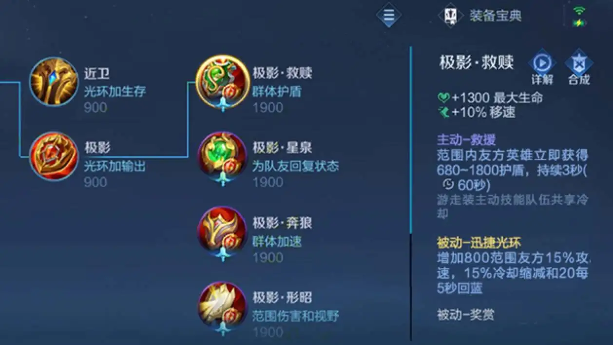 功能软辅要围绕续航与团队功能性展开,通过技能联动提升团队节奏。孙膑、大乔这类英雄,主动辅助装可根据局势二选一。团队缺控制就选形昭之鉴减速留人,需要重点保护队友则用救赎之翼团队护盾。至于前置则都推荐极影,因为极影可以增强射手的攻速,并且还能减少自身技能的冷却。控制型辅助的核心是最大化控场效果,同时保证自身生存。对于刘禅、鲁班大师这类英雄,近卫和极影的适配性都很高。阵容进攻性强就用极影,被动防守就用近卫。三级辅助装的话,星泉和奔狼都是不错的选择。星泉弥补他两在线上没有回血能力的弊端,奔狼则是强化开团能力。