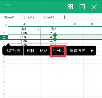 选择隐藏行的上一行,点击“行列”后,可以点击“取消隐藏”即可恢复数据行的显示