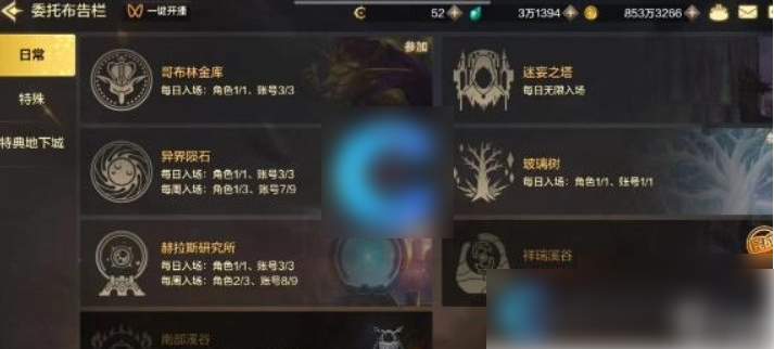 2、进入委托布告栏后,在日常中可以查看各种特殊地下城。