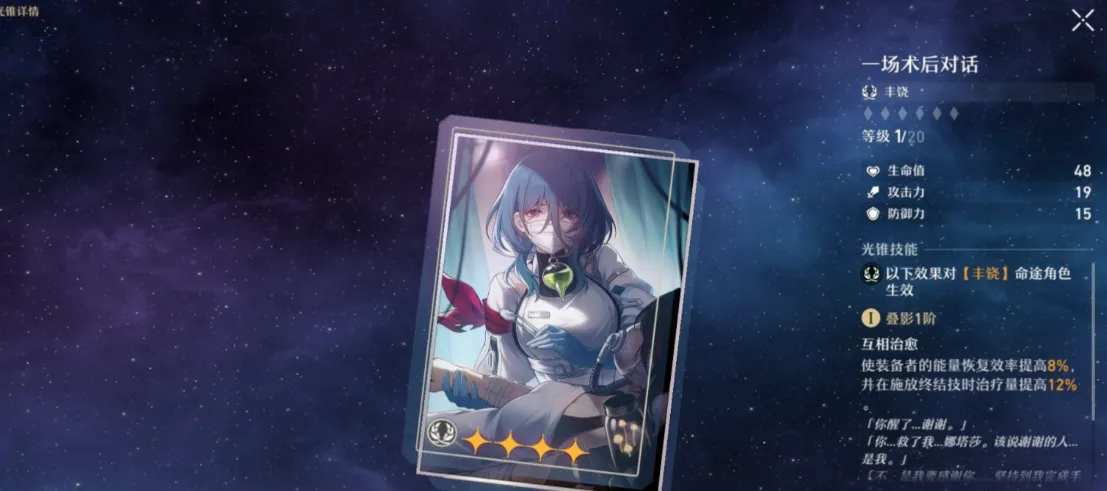 若更看重回能效率与大招循环,“一场术后对话”是理想之选。这款光锥在叠影3时,只要加拉赫不受击,三次普攻就能充满大招。对于需要频繁释放大招,或应对紧急治疗需求的场景来说就是最为好用的。而三星光锥“蕃息”则是低成本的福音,易叠影的特性让它能在普攻后直接提升加拉赫的行动速度。大幅优化充能与行动循环,搭配充能绳使用效果更佳,常规获取渠道也很容易入手。