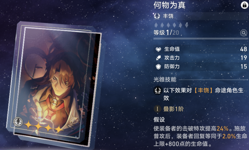 加拉赫作为丰饶角色,其天赋与击破特攻深度绑定。所以在光锥选择上,优先考虑能强化击破收益或优化回能循环的丰饶光锥。比如忘却之庭商店可兑换的“何物为真”,它不仅能提供击破特攻加成,普攻还能为全队附加治疗效果。在环境压力不大的持久战中,既能发挥他的击破优势,又能稳定补充团队血量。