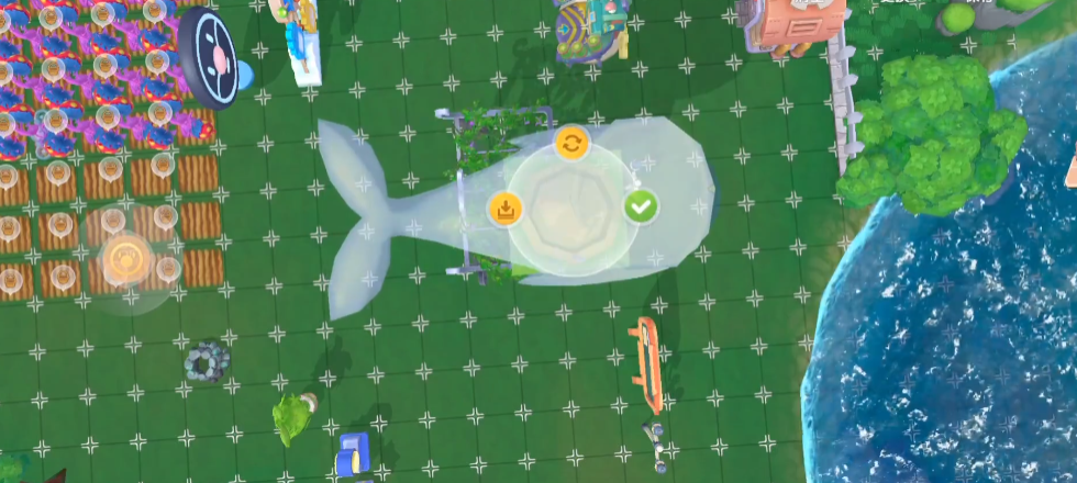 底座搭建完成后,即可放置目标家具。将你想要悬浮的家具,例如白白鲸喷泉,拖到紫藤花架顶部的平台上,当家具显示为绿色的可放置状态时,点击确认固定。按顺序将紫藤花架、地砖和圆石板逐一回收撤掉,此时家具便会保留在空中。需只有占地面积大于1x3的家具才能成功实现悬浮,太小的家具可能无法卡住。