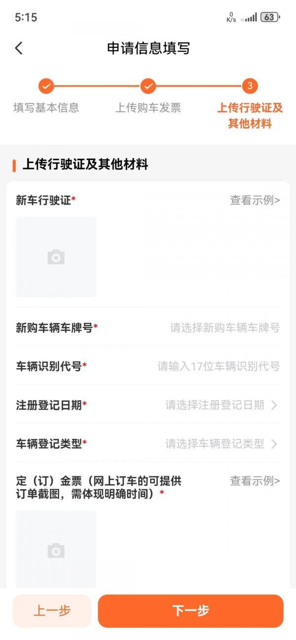 在该页需上传新车行驶证、定(订)金票、新购车辆合同,并填写车牌号、车辆识别代号等信息;