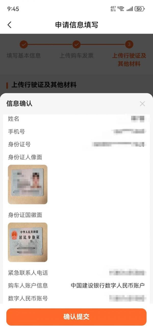在该页仔细核对填写申请人的基本信息,上传身份证正反面图像,填写紧急联系人电话(仅用于联系不上申请人时使用),选择领取补贴账户信息(中国建设银行数字人民币账户或者银行账户,需二选一);
