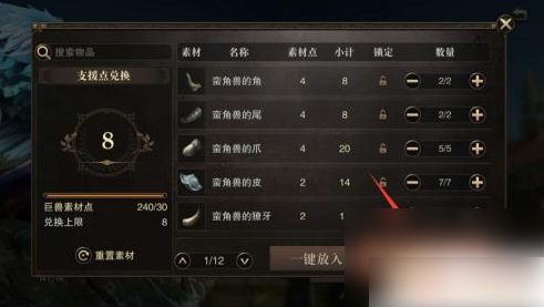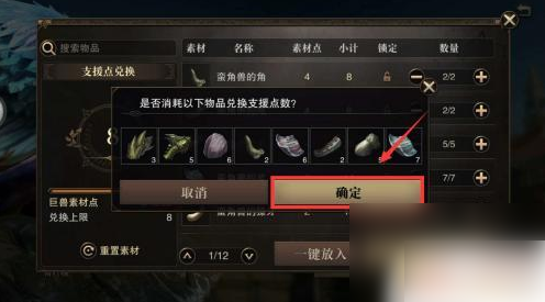 3.兑换支援点需要消耗巨兽素材,为了方便。我们可以点击,不喜欢系统自己匹配的也可以点击每项素材后面的来设置数量。