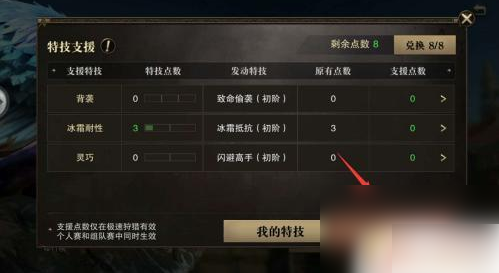 2.进入特技支援加点界面,每位玩家初始拥有8点特技点, 不过需要我们自己兑换。