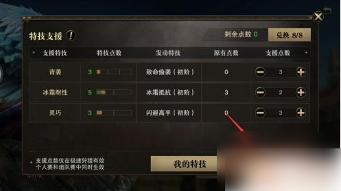 6.支援特技分为背袭、冰霜耐性以及灵巧,这三项可以合理运用。其中本场竞技挑战的是巨兽苍龙,有强大的寒冰攻击技能,所以小伙伴们可以在冰霜上多加一点,加好后点击即可。