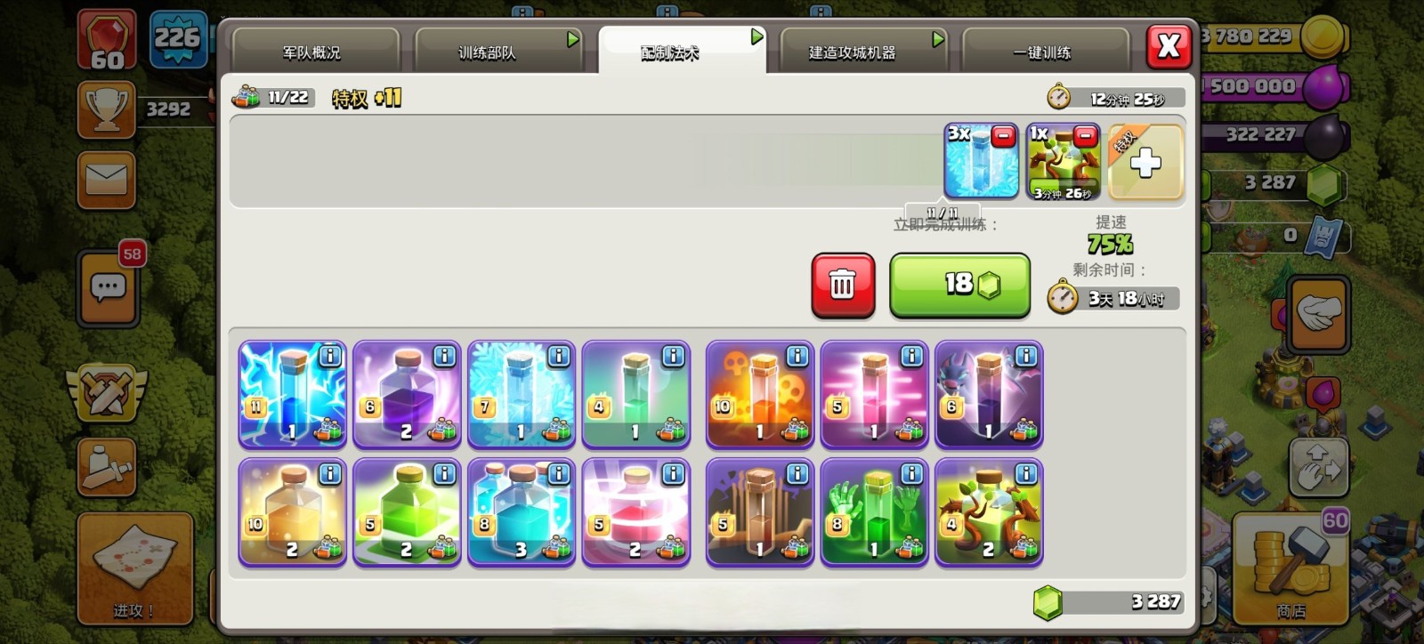 不过使用骷髅法术也有讲究,它的骷髅生命值很低,只有30点左右。容易被法师塔、迫击炮这类范围伤害防御瞬间清掉,所以释放时要避开这些区域。而且骷髅是地面单位,会被城墙挡住,进攻前得先用炸弹人或地震法术破墙。到了10本以上,范围防御升级后伤害提升。骷髅的效果会减弱,不过依然是必带的法术之一。总之骷髅法术是低成本高性价比的辅助法术,只要用好牵制效果拉满。