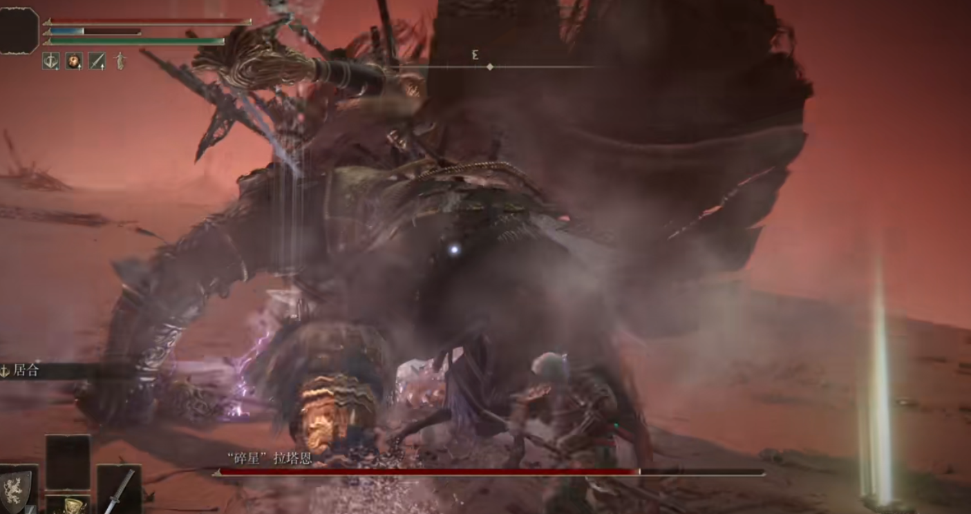 碎星拉塔恩的体型比较大,拉扯方面非常的困难,需要及时看清楚它的起手动作。触发BOSS战以后,先骑上马往后面跑。因为它会朝着咱们远距离射出一箭,拉远一点的话就有足够的躲避时间。当看见远处有紫色光过来的时候,往侧边去跑躲开它的第一发攻击。当锁定丢失以后,迅速调头朝着碎星拉塔恩的方向,这样它就不会再次发射弓箭了。当咱们离它的距离足够近的时候,它就会举起双刀往我们这边跑过来,离近距离的时候碎星拉塔恩会使用出一个六连劈。当自己靠近BOSS的时候,它的这个招式是打不着咱们的,而且同时有三次使用战技居合的时间。在它放这招的时候,他会前抬脚往前面迈一步,掌握好节奏钻到它后面,就能对其进行伤害白嫖。