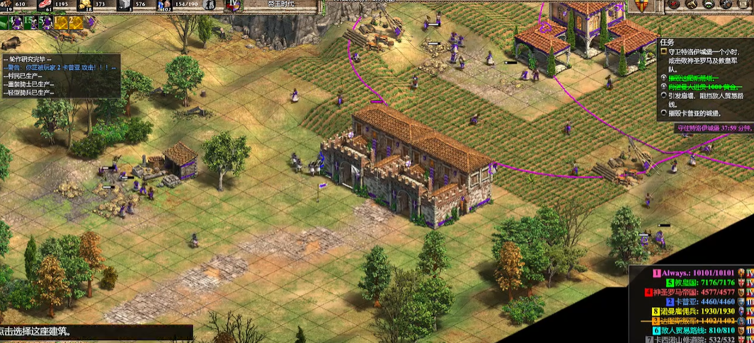 成功渡过初期的猛攻后,游戏进入中期相持与发展阶段。此时经济管理至关重要,需要保持农民不间断生产,避免资源断档,尤其是木材和食物的持续采集是维持军事力量的基石。在防守布局上,可以围绕核心建筑建造城墙形成缓冲带,并合理调配兵力以应对不同方向袭来的攻击波次。