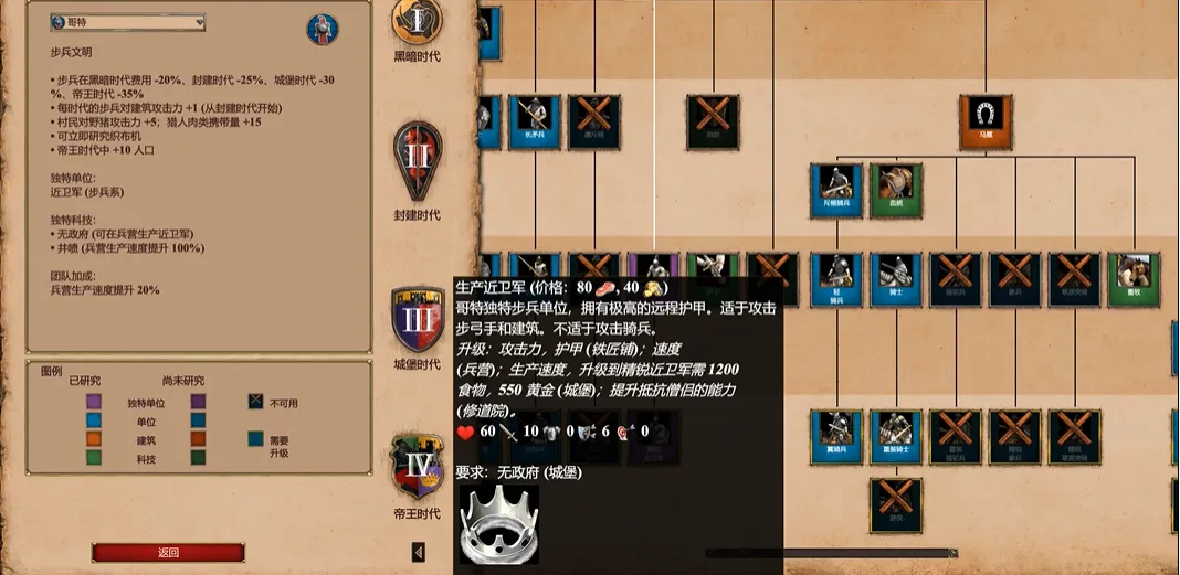 哥特近卫军是哥特文明的标志性特色兵种,其核心战略价值在于极高的远程防御、极快的生产速度以及对建筑物的额外破坏力,这些优势共同构成了其人海战术的压迫感基础。该单位在城堡时代可通过城堡训练,研发帝王时代的无政府科技后便可直接在兵营中量产,结合哥特文明自封建时代起享受的步兵成本递减及兵营训练加速特性,能在帝王时代形成近乎源源不断的步兵洪流,是哥特后期战术的绝对核心。