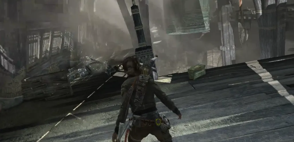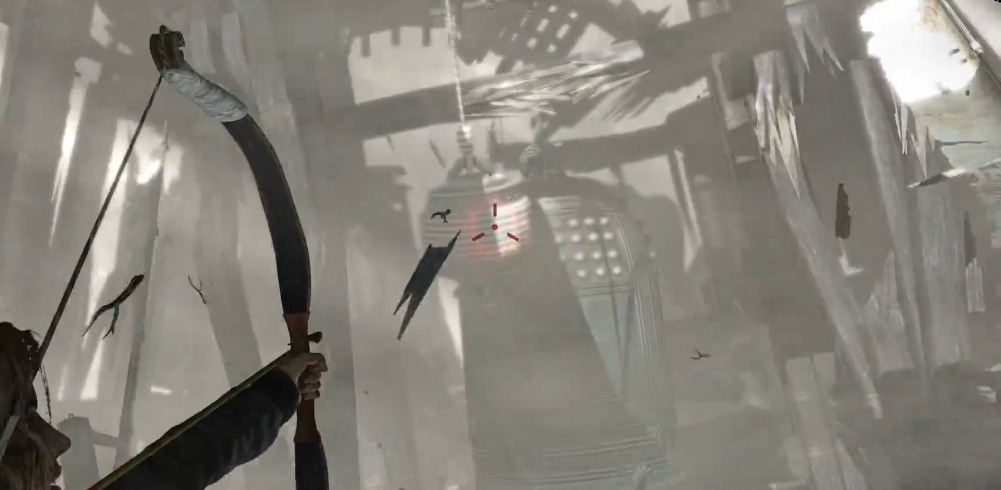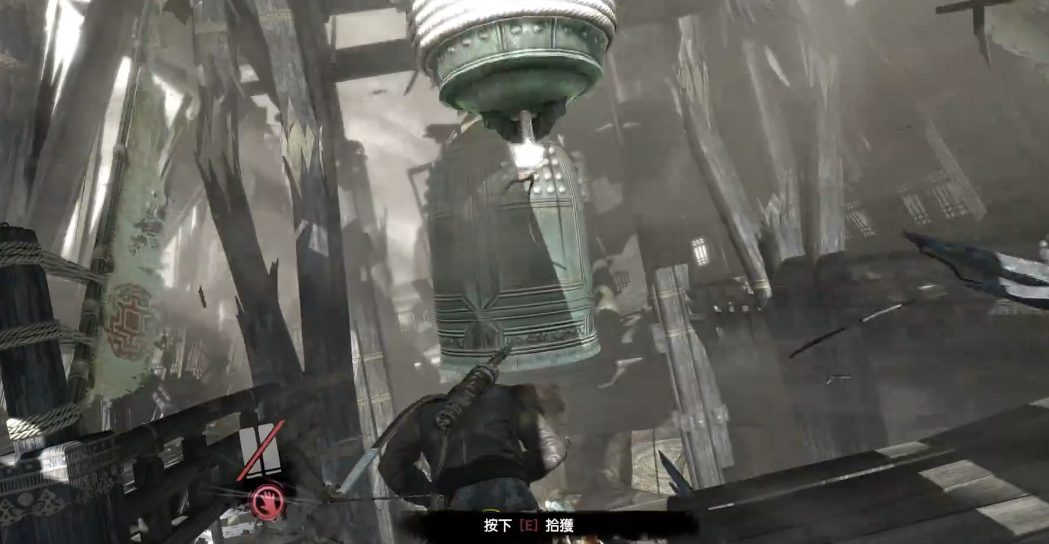 当大钟左右两侧的木柱都已被成功撞断后,谜题便进入了最终阶段。玩家需要返回窗户边,将两扇窗户的曲柄机关都操作一遍,确保两扇窗户都处于完全打开的状态,使室内风力达到最大。最后一次使用绳索箭拉动摆锤,这次摆锤将在强风的加持下以更大的幅度摆动,其目标不再是侧面的柱子,而是撞击支撑大钟顶部的横梁或主梁。当摆锤成功撞击横梁后,失去所有支撑的大钟便会坠落,砸穿房间的地板,从而开辟出通往下一区域的通道,标志着该谜题被成功解决。
