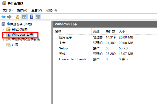 3、在事件查看器中,左下侧边栏中打开windows日志。