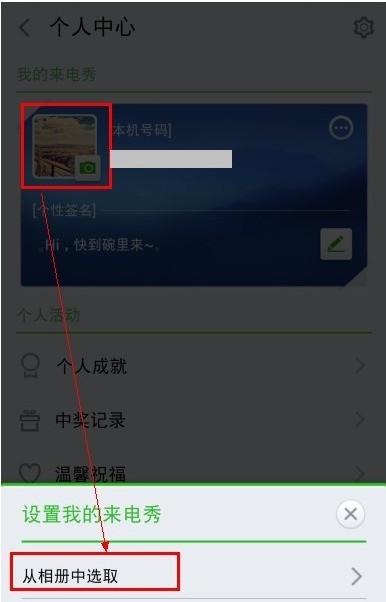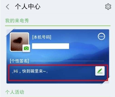 5、来电秀图片设置成功后,设置个性签名,点击如图所示个性签名区域,在文本框中输入签名后点击“确定”按钮完成设置