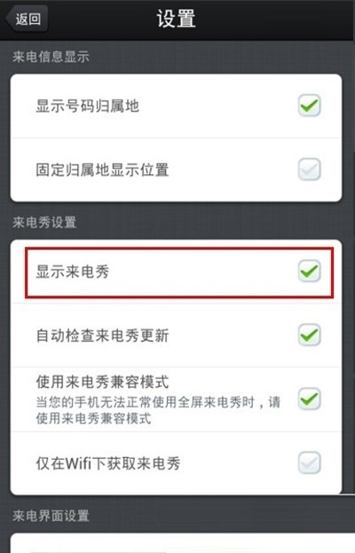 7、若想取消来电秀功能,只需取消勾选“显示来电秀”复选框按钮即可
