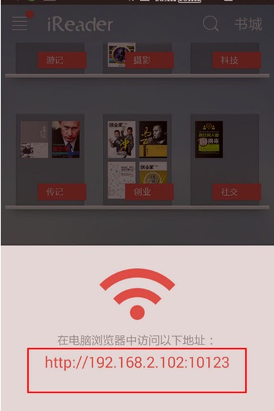 4、将手机页面出现的IP地址,填入到电脑浏览器地址栏当中,浏览器窗口会出现iReader的界面