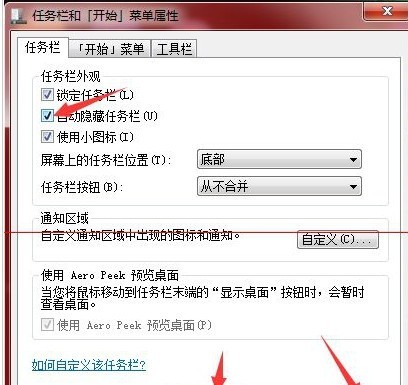 4、如果需要自动隐藏任务栏,勾选如图所示的“自动隐藏任务栏”,点“应用”和“确定”即可。