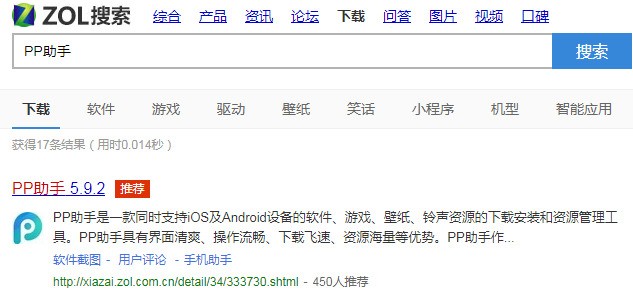 1、在中关村在线下载频道搜索PP助手