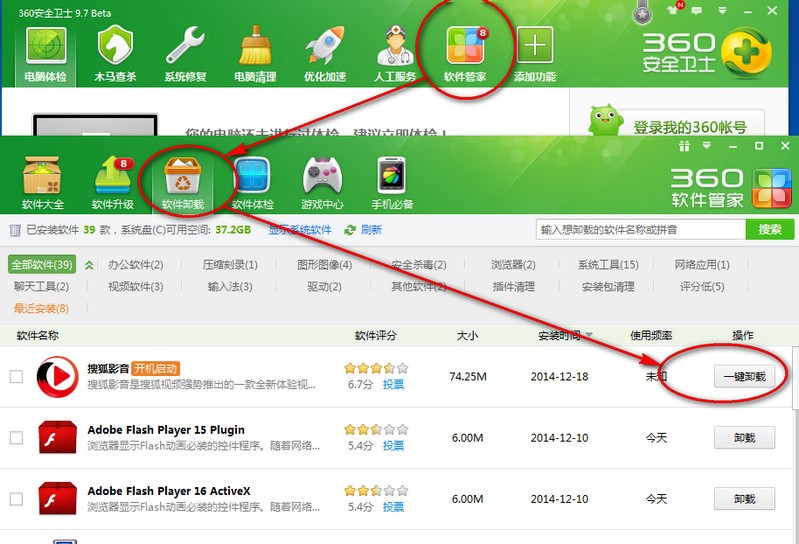 方法一:有360安全卫士的朋友,打开“360安全卫士”点击“软件管家”,“卸载软件”中点击“一键卸载“