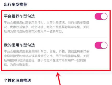 5.在个性化选项页面里“出行车型推荐”的下方会看到有“平台推荐车型勾选”和“我的常用车型勾选”,在它们的后面点击对应的开关按钮设置为彩色即为可启。