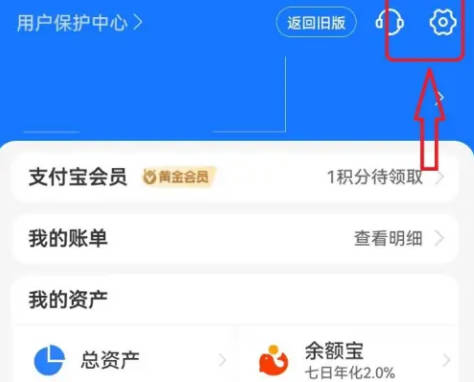 1.在手机中点击打开支付宝软件进入后,在页面的右下角点击“我的”进行切换,再在我的页面里右上角点击一个齿轮形状的“设置”图标。