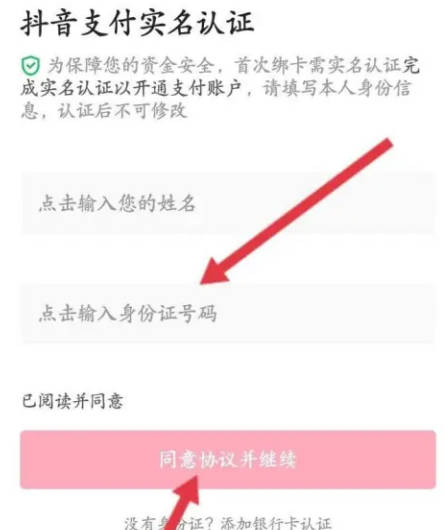 4.接下来在进入的页面里会需要进行抖音支付实名认证,按照提示输入姓名和身份证号码,再点击下方的“同意协议并继续”按钮完成实名认证即可开通抖音零钱。
