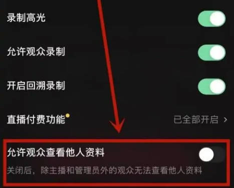5.最后在进入的窗口中有一个“允许观众查看他人资料”,在它的后面点击开关按钮设置为关闭状态,除了直播间的主播和管理员以外其他观众就无法再查看他人资料了。