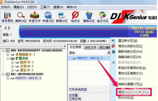 5、保存更改后,鼠标右键单击想要合并分区的盘符,点击"调整分区大小"。