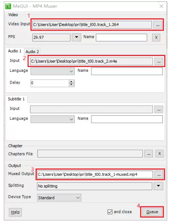 Muxed Output 填最终保存路径与文件名 → Queue → 回到主界面点 Start;几秒到几分钟后即可得到包含音视频的完整 MP4/MKV 文件。