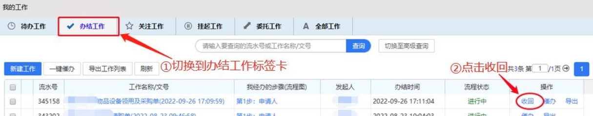 3、在“我的工作”窗口中,切换到“办结工作”标签卡,点击收回即可。