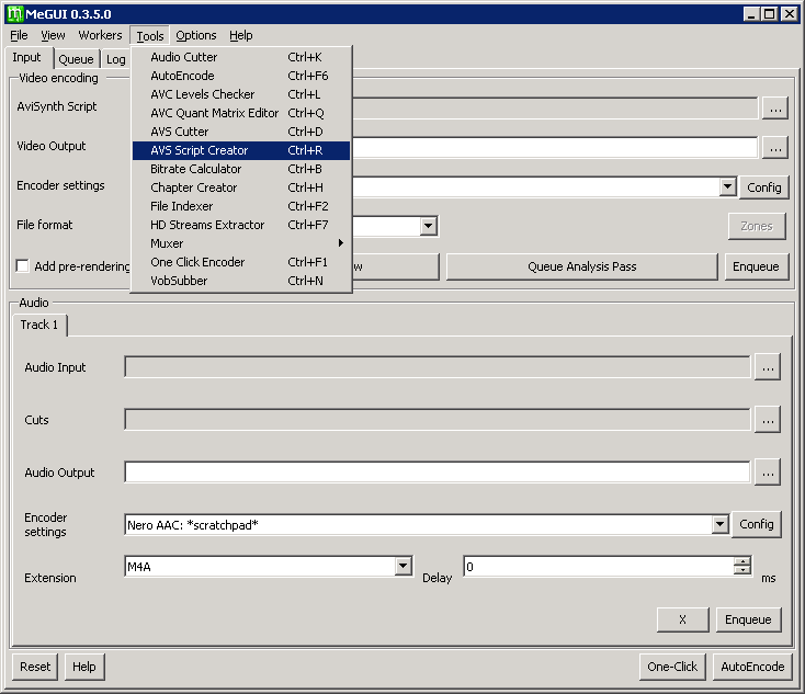 创建 AVS:打开 MeGUI,点击 Tools 菜单中的 AVS script Creator,弹出新窗口后点击按钮选择从原盘分离出的视频文件。