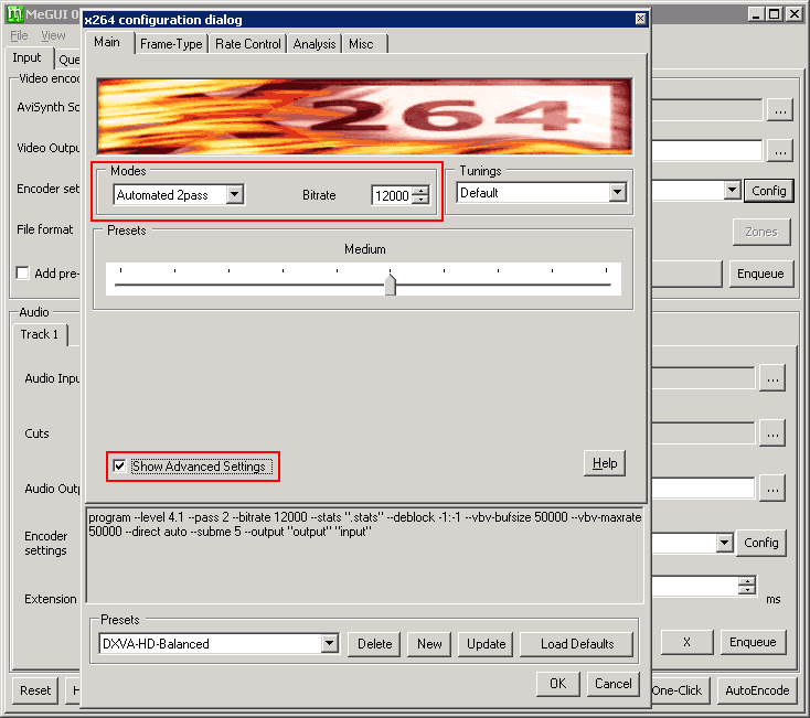 配置参数:点击 Config 按钮,勾选 Show Advanced Setting,Modes 选 Automated 2pass,设置 Bitrate(1080P 的 RiP 码率 8000 - 15000,720P 的 4000 - 8000),完成后点击 New 按钮命名并保存为模板,最后点击 OK 返回主窗口。
