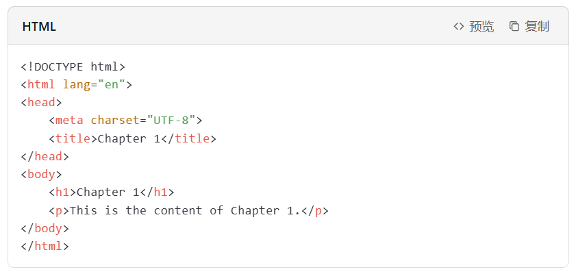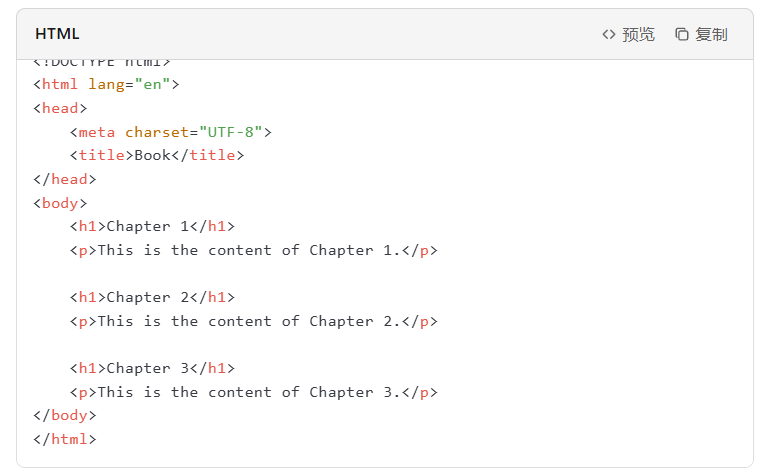 在HTML文件中,使用<h1>、<h2>等标题标签来标记章节标题。例如: