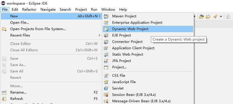 在菜单栏中依次点击 File -> New -> Dynamic Web Project。